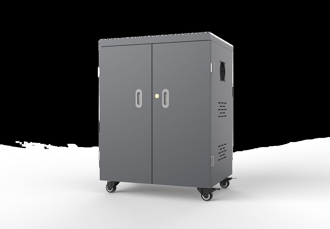 54 USB Ports Charging Cart has two front doors(closed by a safey lock) for access to the devices' compartment and two behind doors(closed by a safety lock) access to the power department. The cart is a easy-to-use and easy-to-move with four german medical standard ultra-quiet universal wheels, two with brake.